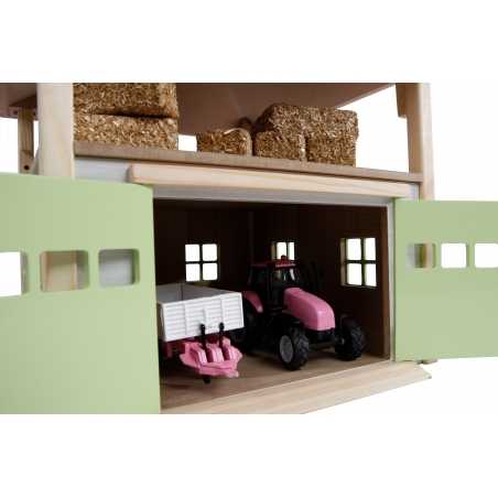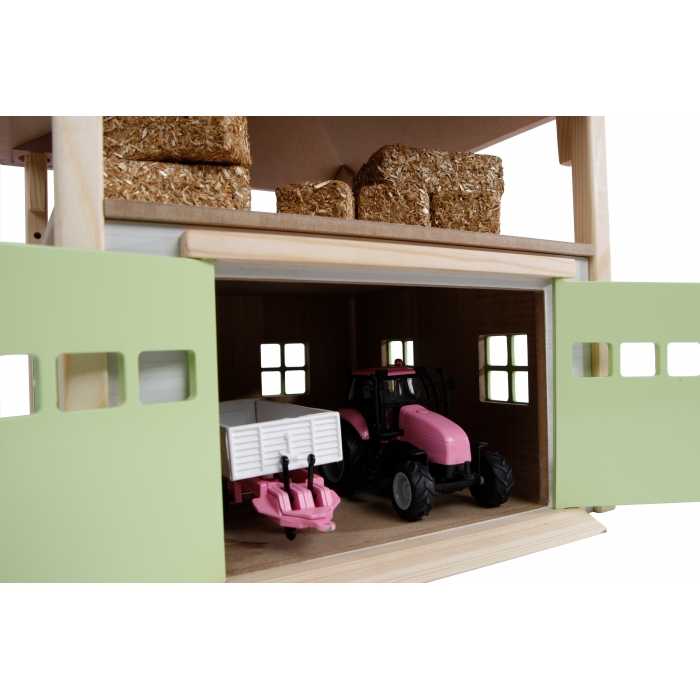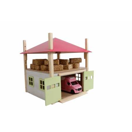 This 1:32 scale wooden hay barn is used to park a trailer or tractor inside the barn with a large doorway. The doors can be opened or closed. The hay barn has a loft to store food for all animals. The roof can be height-adjustable and removable to have easy access to play.